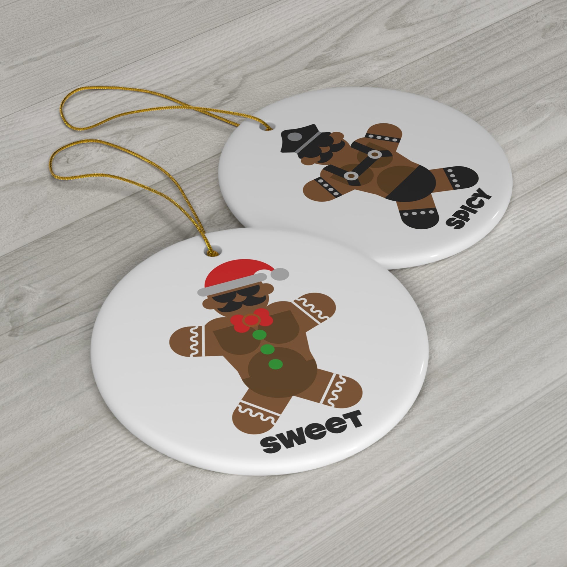 This gingerbread man is ready to make some mischief! This two sided, round, ceramic ornament shows his sweet and his spicy side!